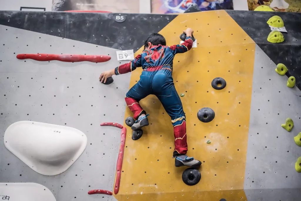 C’est une forme d’escalade sans corde ni harnais, sur des murs de 4,5 m de haut maximum, avec de bons gros tapis de réception. Ludique et facilement accessible à tous les âges.